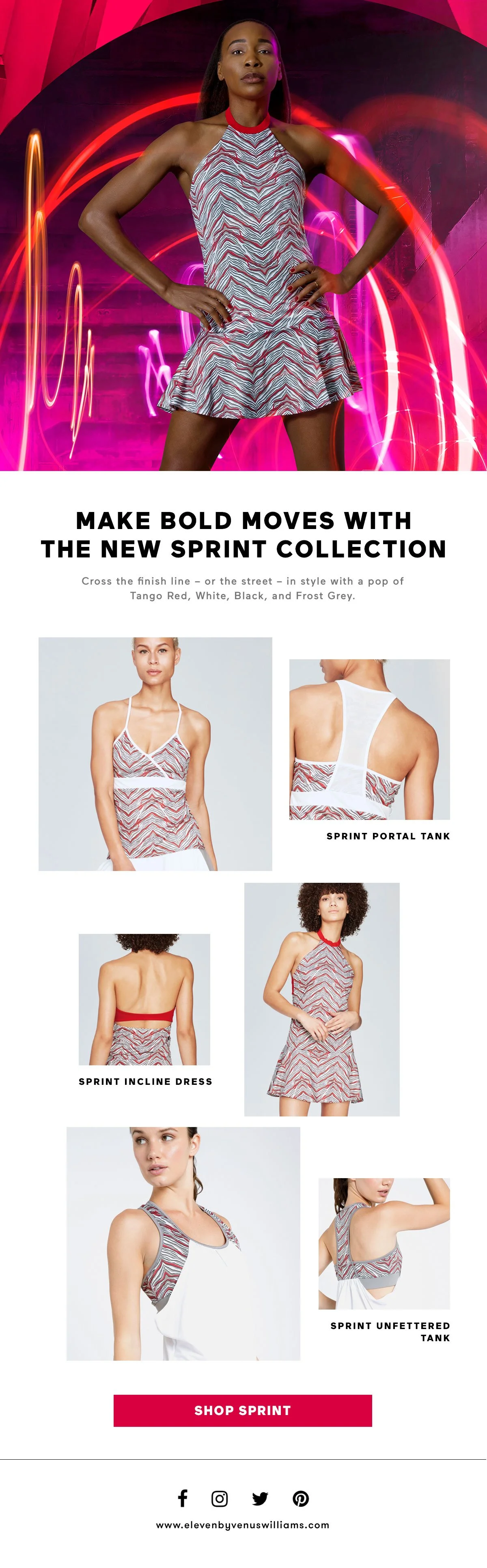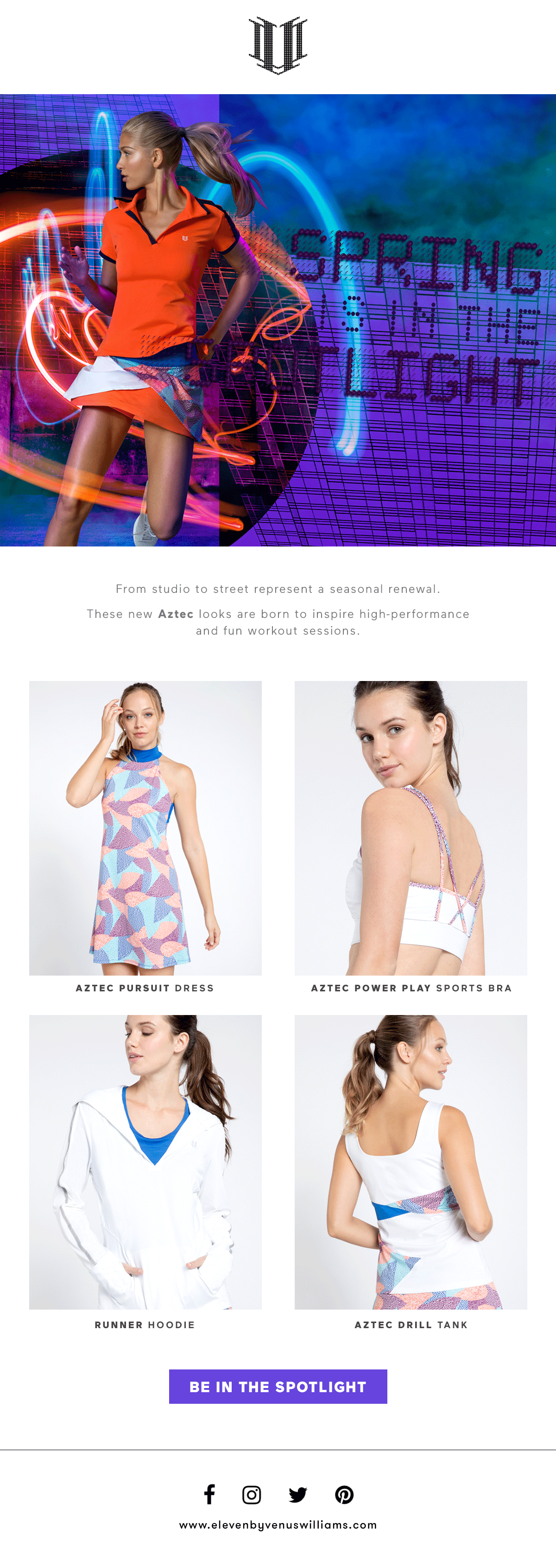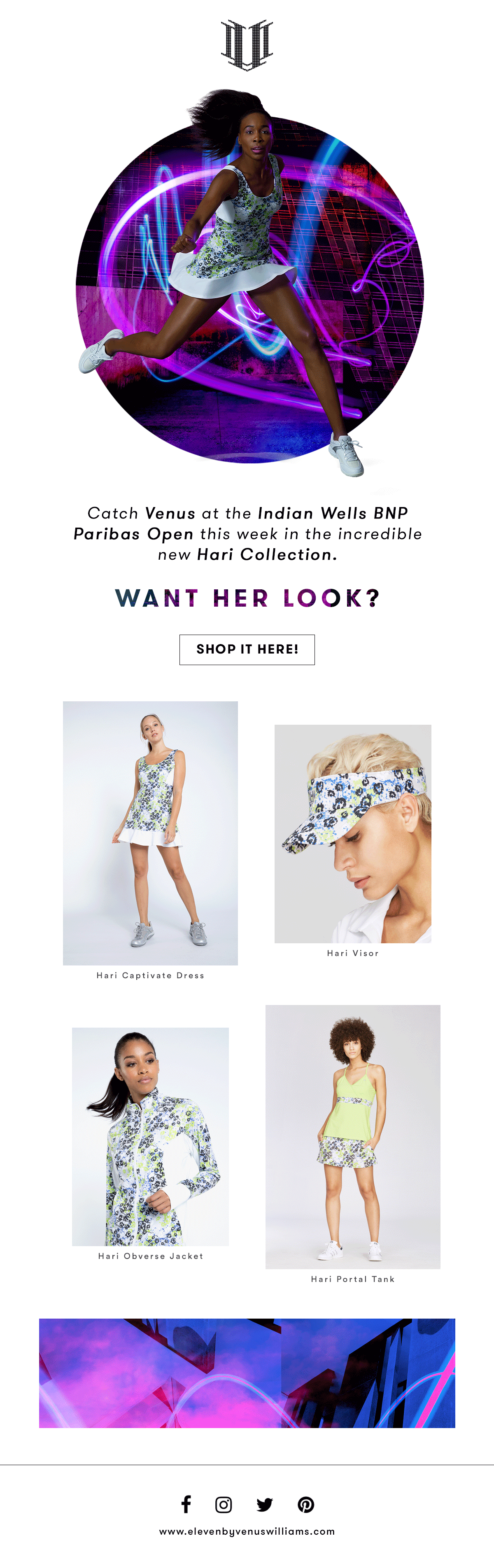 Email and social teasers revealing what Venus was wearing on court, directing fans to shop the exact outfit she was debuting globally that day.